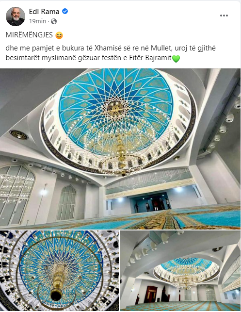 dhe me pamjet e bukura të Xhamisë së re në Mullet, uroj të gjithë besimtarët myslimanë gëzuar festën e Fitër Bajramit?
