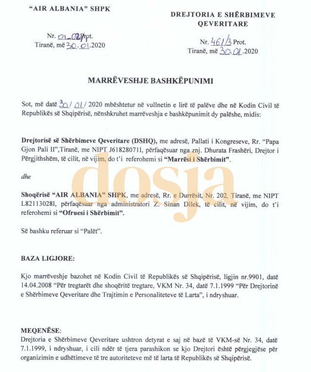 Dosja.al ka sjellë marrëveshjen e firmosur me kompaninë “AirAlbania”, e cila nuk përmend në asnjë prej pikave që fluturimet e kreut të qeverisë do të jenë falas në këmbim të një reklame. Nuk bëhet fjalë për një marrëveshje promociale, por bashkëpunim dhe në dokumentin me pesë faqe, caktohen kushtet e të dyja palëve.