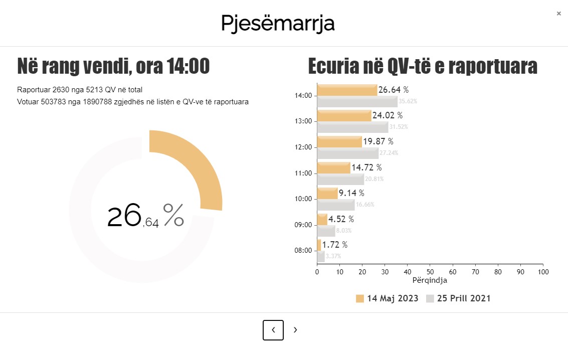 Deri në orën 14:00 kanë marrë pjesë 26.6% e votuesve nga raportimet që janë bërë nga 2630 nga 5213 QV në total.