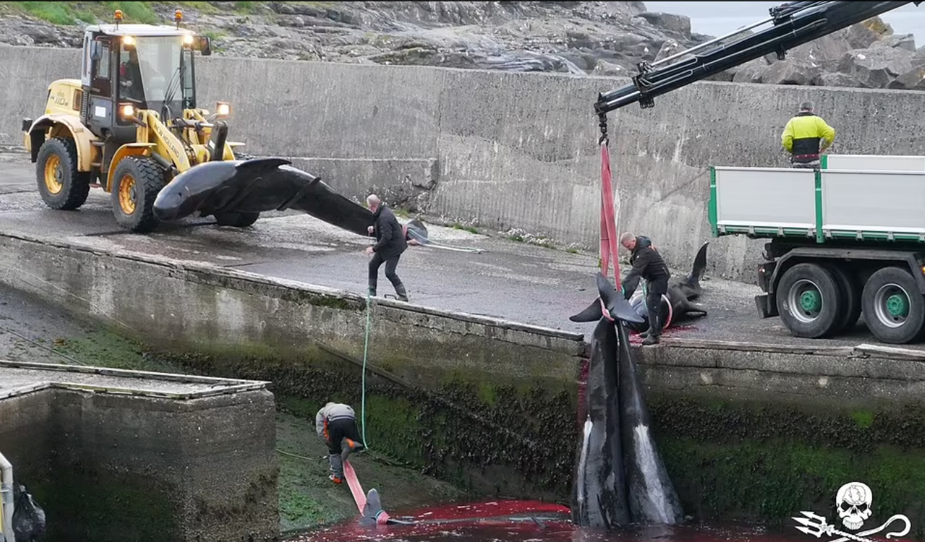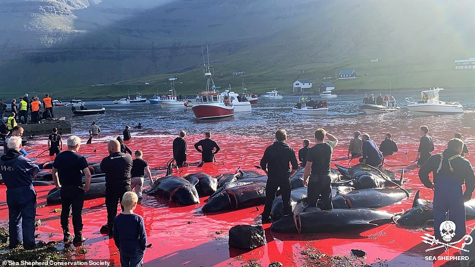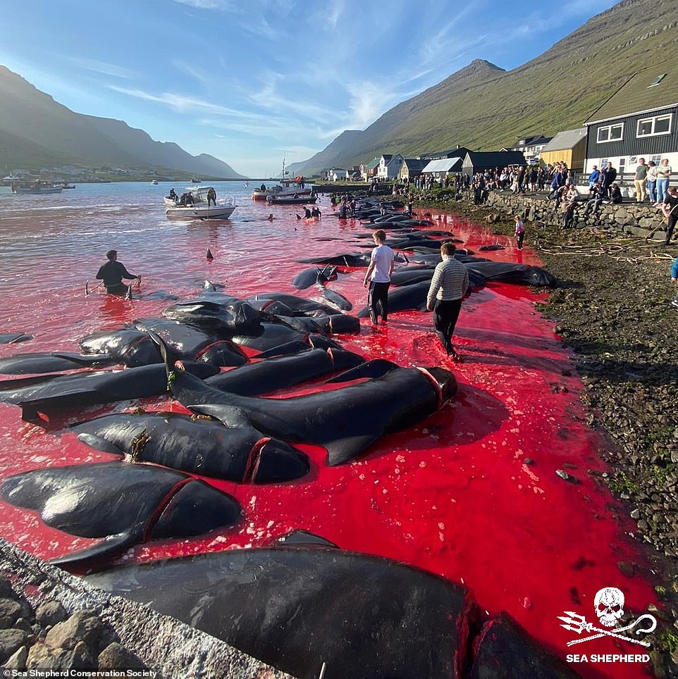 Gjuetarët në Ishujt Faroe kanë vrarë 175 balena, duke e kthyer detin të kuq për shkak të gjakut, pasi anijet i tërhoqën kafshët drejt bregut ku burrat prisnin në me grepa, thika dhe shtiza. Një person i armatosur madje gjuajti me një armë gjahu drejt një droni, i cili u dërgua nga ambientalistët e ‘Sea Shepherd’ për të dokumentuar masakrën, të njohur si Grindadrap ose Grind në gjuhën faroese.