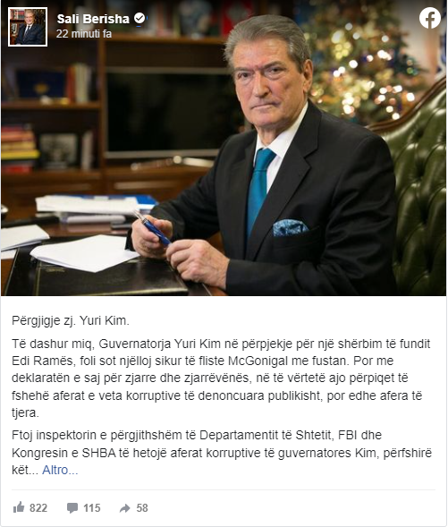 Sali Berisha i kundërpërgjigjet ambasadores amerikane Yuri Kim në lidhje me një përgjigje të dhënë prej saj gjatë një interviste, në të cilën thotë se nuk mund ta pastrojnë korrupsionin nga Shqipëria, njerëzit që janë të korruptuar. Berisha e quan këtë veprim të saj si një shërbim ndaj kryeministrit Edi Rama. Ai e quan këtë përgjigje që ambasadorja ka dhënë si një përpjekje për të mbuluar aferat e veta korruptive të denoncuara publikisht. Kryedemokrati i bindur në transparencën e tij, fton FBI-në dhe institucionet e tjera të SHBA-së për të filluar hetimet e ndaj aktivitetit të ambasadores në Shqipëri.