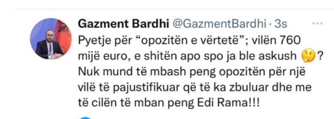 Nëpërmjet një postimi në “Tëitter”, Bardhi ka shtruar pyetjen për atë që quan me ironi “opozitë e vërtetë”, duke pretenduar edhe njëherë se është Edi Rama, ai i cili po mban peng deputetët.