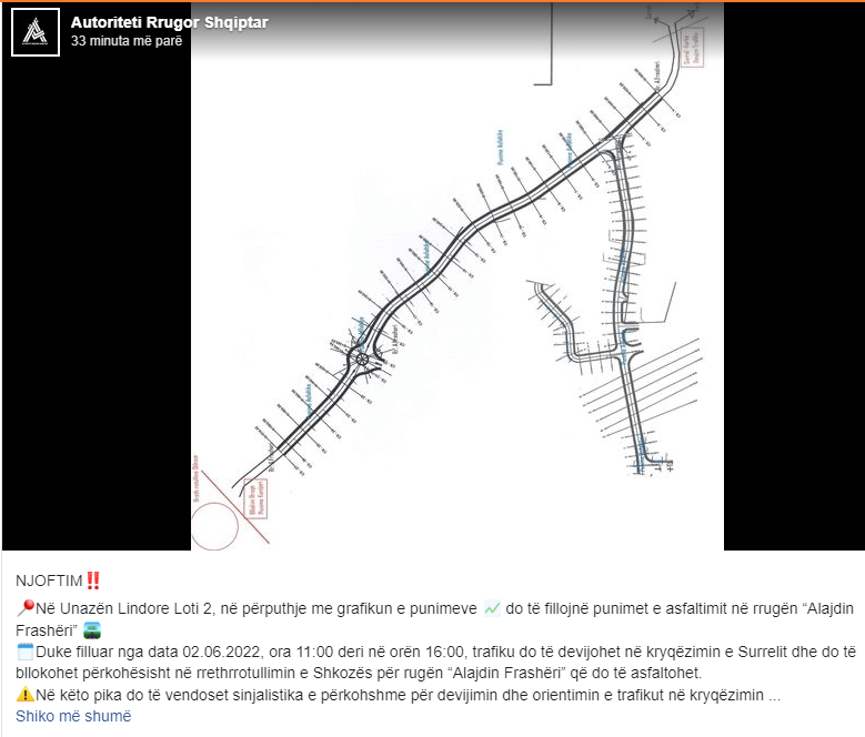 Nëpërmjet një postimi në rrjete sociale, ARRSH bën me dije se devijimi do të bëhet në përputhje me grafikun e punimeve për asfaltimin e rrugës.