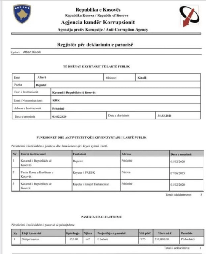 Ndërkohë, Kinolli në formularin e deklarimit të pasurisë, thekson se vetura e tij kap vlerën prej 1 mijë e 500 euro.