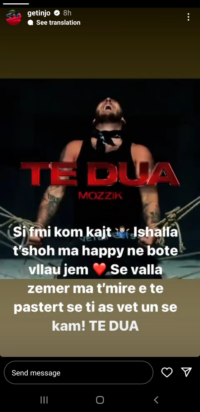 Reperi i njohur Mozzik, është rikthyer sërish në qendër të vëmendjes. Ai ka publikuar këngën më të fundit të titulluar “Të dua”, një dedikim për vajzën e tij, Hanën. Lidhur me tekstin prekës të këngës, ka reaguar edhe vëllai i reperit. Getinjo shkruan se kjo këngë e ka prekur shumë dhe i uron vetëm lumturi vëllait të tij.