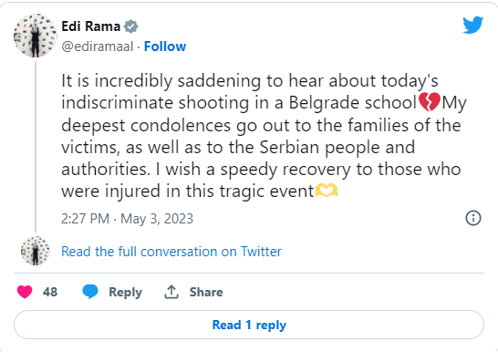 Është jashtëzakonisht e trishtueshme të dëgjosh për të shtënat e sotme pa dallim në një shkollë të Beogradit ?Ngushëllimet e mia më të thella shkojnë për familjet e viktimave, si dhe për popullin dhe autoritetet serbe. I uroj shërim të shpejtë të plagosurve në këtë ngjarje tragjike!