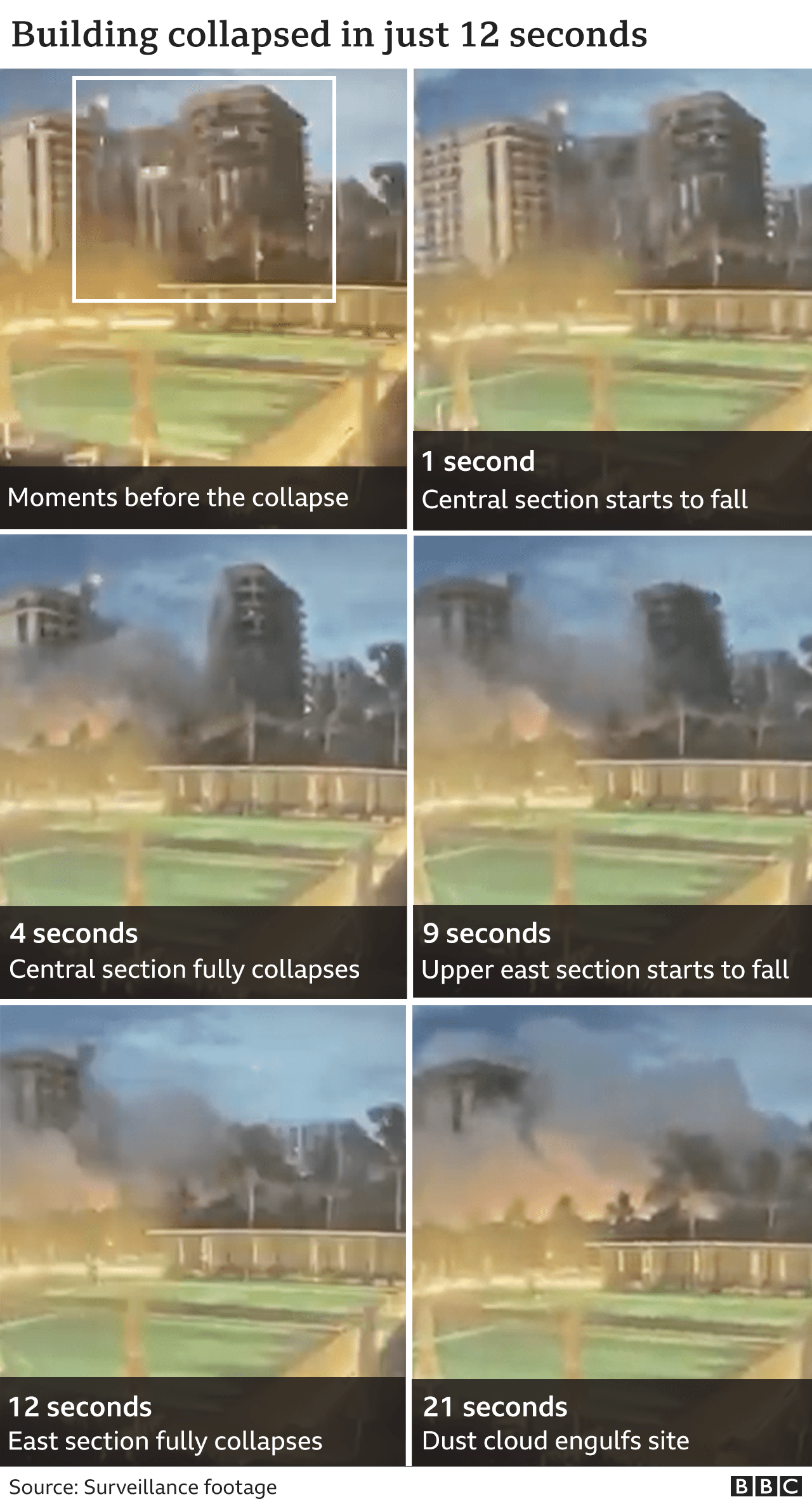 Njëri e krahasoi skenën me sulmet e 11 shtatorit 2001 me Kullat Binjake në New Jork. Imazhet e bëra para dhe pas shembjes tregojnë shkallën e dëmtimit. Në një artikull të publikuar të shtunën në gazetën “New York Times” thuhej se sipas një raporti tre vjeçar hartuar nga një inxhinier ndërtimi, objekti 12-katësh i shembur në Florida, kishte “dëmtime të mëdha strukturore” në pllakën e betonit poshtë strukturës së pishinës.