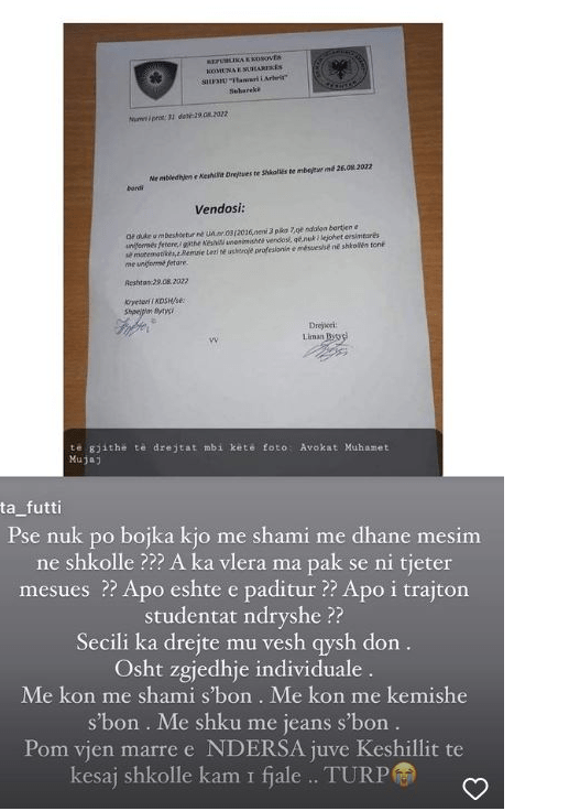 Sipas saj, Këshilli i Shkollës duhet të ketë turp për këtë vendim, pasi mënyra e të veshurit është zgjedhje individuale.