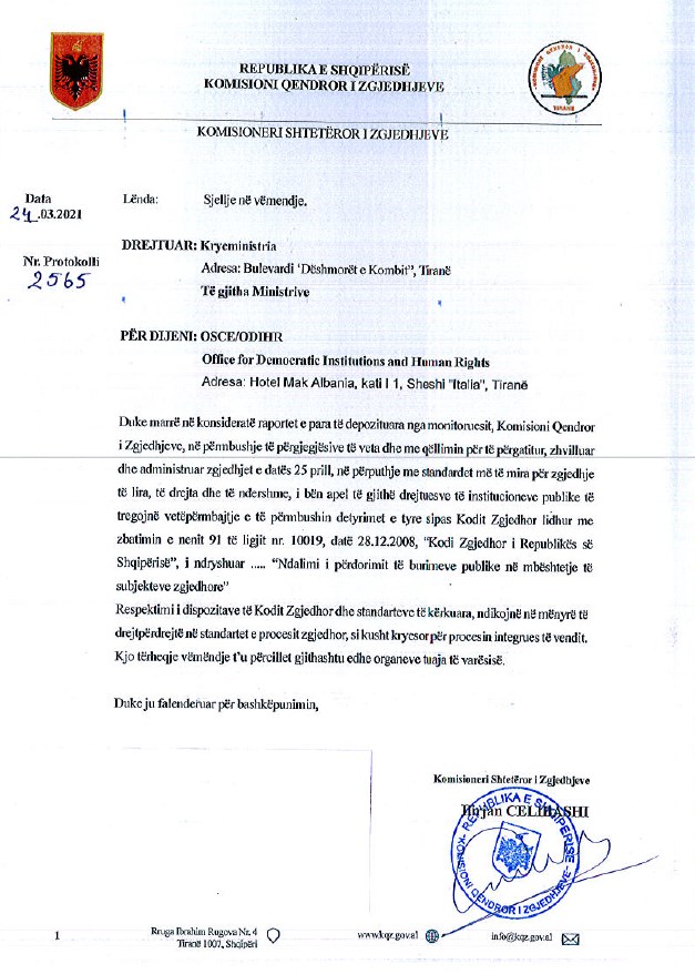 Kjo letër që ka mbërritur në zyrën e Kryeministrit, të gjithë ministrave dhe partive politike, i ka shkuar dhe misionit të OSBE në Tiranë që do të monitorojnë zgjedhjet.