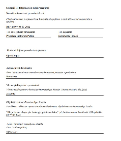 Një gjë e tillë ka ndodhur edhe në institucionin e Presidencës në lidhje me një tender të bërë së fundmi. Burimet për median bëjnë me dije se Presidenca ka hapur një tender për blerje bojërash për fotokopje, printera e fakse. Procedura mban numrin e referencës REF-24997-04-13-2022 dhe ka fondin limit prej 2.500.000 lekë të reja, ose 25 milionë lekë të vjetra.