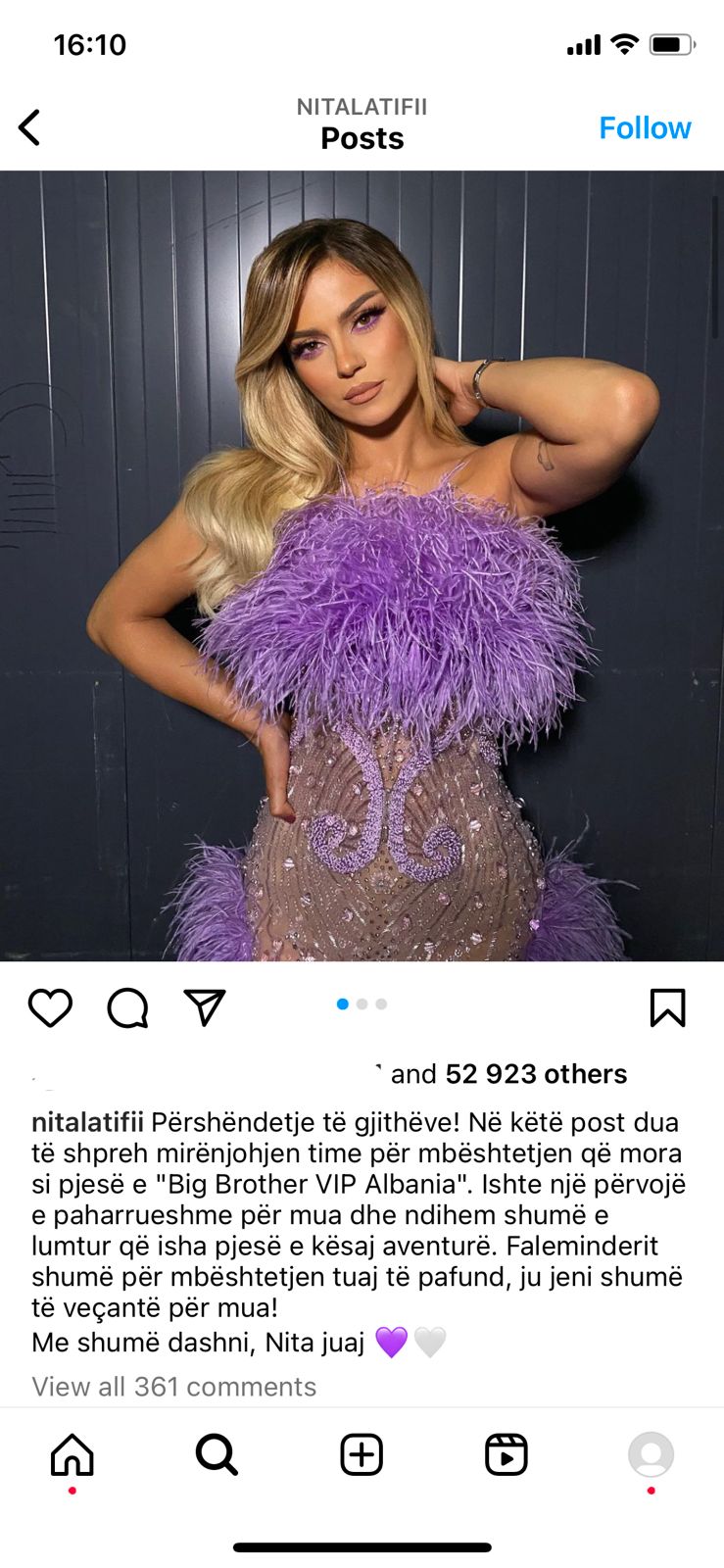 “Përshëndetje të gjithëve! Në këtë post dua të shpreh mirënjohjen time për mbështetjen që mora si pjesë e “Big Brother VIP Albania”. Ishte një përvojë e paharrueshme për mua dhe ndihem shumë e lumtur që isha pjesë e kësaj aventurë. Faleminderit shumë për mbështetjen tuaj të pafund, ju jeni shumë të veçantë për mua!