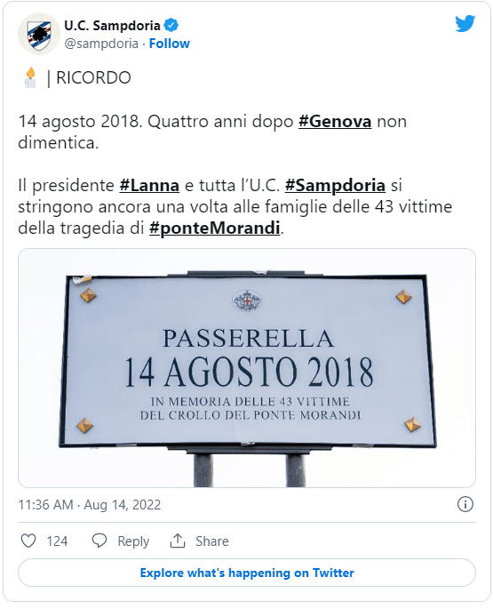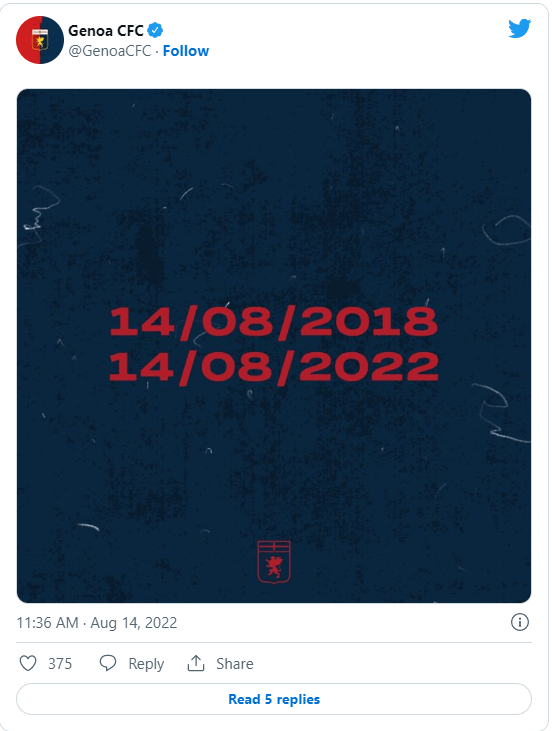 Më 14 gusht të vitit 2018, në orën 11:36, u shemb ura “Morandi” duke marrë me vete 43 viktima të pafajshme. Genoa dhe Sampdoria sot gjithashtu kanë kujtuar ngjarjen me nga një postim në rrjetet e tyre sociale.