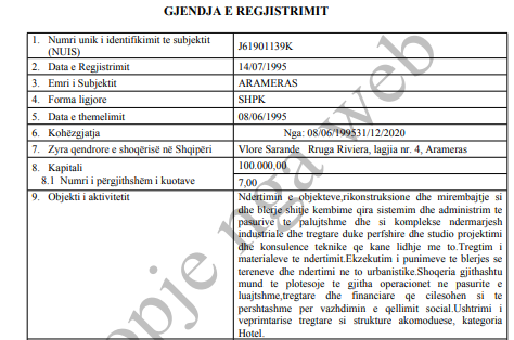 Me VKM ne. 514, datë 01.07.2020, ka përfituar pasurinë shtetërore në Gjirin e Limonit Sarandë me sipërfaqe 265 mijë m2.