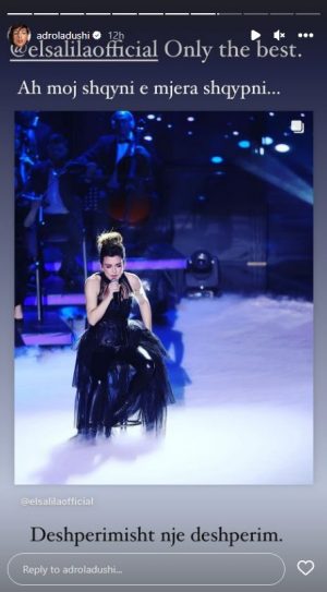 Ajo ka ndarë një foto të Elsa Lilës në Instastory, teksa ajo po performon. Modelja shprehet “e dëshpëruar”, pavarësisht se Elsa Lila fitoi çmimin e parë të “Festivalit të Këngës”.