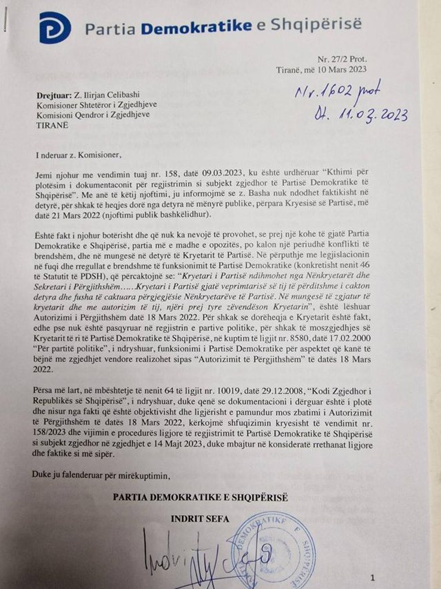 Me anë të një njoftimi dhe kërkese, përfaqësuesi ligjor i Partisë Demokratike, Indrit Sefa i është drejtuar sot Komisionit Qendror të Zgjedhjeve, për të vijuar me regjistrimin e PD në zgjedhjet lokale të 14 majit edhe pa dokumentacionin me firmën e Lulzim Bashës.
