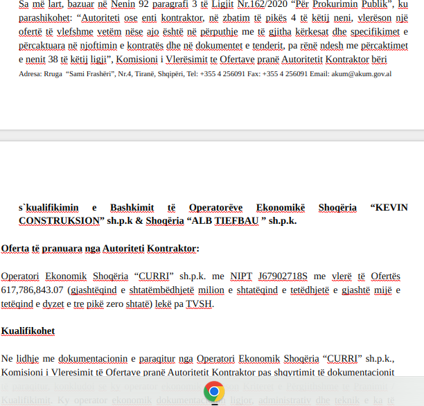 Konkretisht, bëhet fjalë për tenderin me fond limit 6.3 milionë euro për rikonstruksionin e Magjistralit Kryesor dhe Rrjetit të brendshëm të Ujësjellësit të Qytetit Patos, Loti III.  Në garë kanë marrë pjesë vetëm dy kompani, “Curri shpk” e Faik Currit dhe Bashkimi i Operatorëve Ekonomikë Shoqëria “KEVIN CONSTRUKSION” sh.p.k & Shoqëria “ALB TIEFBAU” sh.p.k.