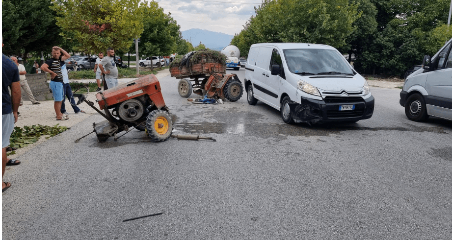 Një mjet bujqësor i ka prerë rrugën një fugoni, tip Citroen me targa të huaja dhe mjeti bujqësor është ndarë në mes të rrugës.