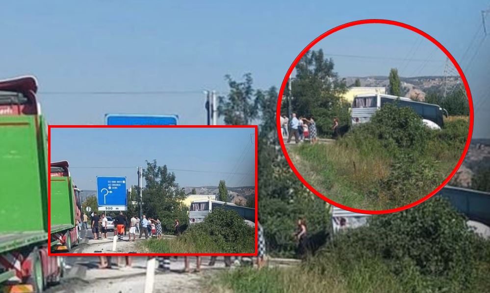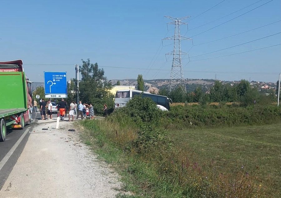 Një autobus me pasagjerë është aksidentuar me një mjet të tonazhit të rëndë, trajleri dhe ka dalë nga rruga.