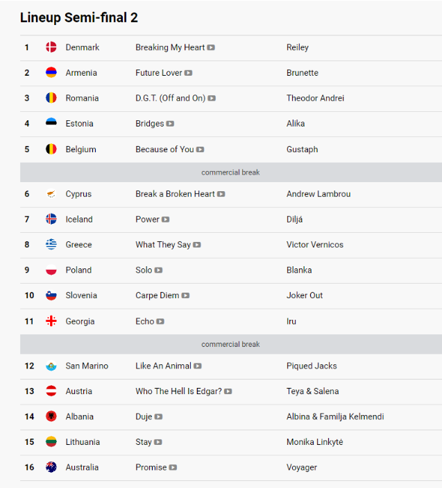 Ndërkohë shtete që u kualifikuan në gjysmëfinalen e parë për në finalen e madhe janë: