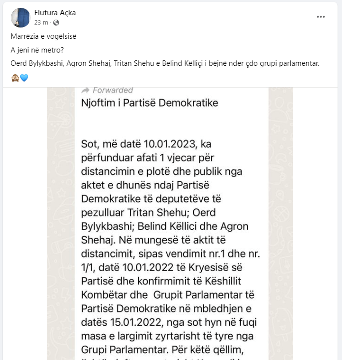 “Marrëzia e vogëlsisë! A jeni në metro? Oerd Bylykbashi, Agron Shehaj, Tritan Shehu e Belind Këlliçi i bëjnë nder çdo grupi parlamentar”, shkruan Açka.