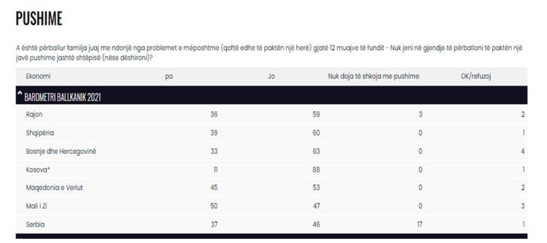 Një anketë e Këshillit të Bashkëpunimit Rajonal, e azhurnuar në Barometrin e Ballkanit 2021, tregoi se 39% e familjeve në Shqipëri nuk e përballonin ekonomikisht një javë pushime në vit (shih tabelën bashkëngjitur).