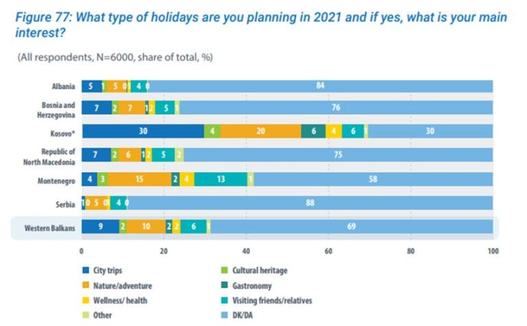 Në Ballkan, shumica dërrmuese e pjesëmarrësve në anketë nuk e dinë nëse do të shkojnë me pushime (69%), pak më pak se një e treta e qytetarëve (31%) tashmë kanë planifikuar udhëtimin e tyre për vitin 2021. Rreth 10% po planifikojnë të udhëtojnë në natyrë ose udhëtim aventure, 9% e tyre planifikojnë të vizitojnë qytete të reja, dhe 6% të vizitojnë familjen dhe miqtë e tyre.