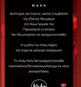 “Fatkeqësisht, për arsye shëndetësore, paraqitja e Eleni Foureira në Nava Seaside të premten më 22 korrik nuk do të mund të bëhet. Ekipi i Kinky Nights i uron asaj shërim të shpejtë. Kinky Party do të vazhdojë normalisht dhe ne do të jemi në kontakt sërish për rezervime”, thuhet në deklaratë.