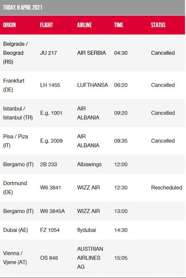 Aeroporti i Rinasit ka dalë me njoftimin e radhës, ku bën me dije se janë anuluar fluturimet e ditës së sotme. TIA ka njoftuar në faqen zyrtare anulimin e fluturimeve të paradites së sotme, ndërkohë që ende nuk ka asnjë vendim për fluturimet e orëve të pasdites.