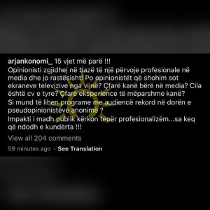 “15 vite më parë. Opinionisti zgjidhej në bazë të një përvojë profesionale në media dhe jo rastësisht. Po opinionistët që shohim sot ekraneve televizive nga vijnë? Çfarë kanë bërë në media? Cila është CV e tyre? Çfarë eksperience të mëparshme kanë? Si mund të lihen programe me audiencë rekord në dorën e pseudo-opinionistëve anonimë? Impakti i madh publik kërkon tepër profesionalizëm…sa keq që ndodh e kundërta!!!”, shkruan Arjan Konomi.