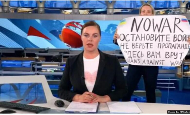 Ovsyannikova më 14 mars u shfaq në transmetim të drejtpërdrejt në një program informues të televizionit rus, Channel One, duke mbajtur në duar një pano ku ndër të tjera shkruhej: “Ndaloni luftën. Mos i besoni propagandës. Ata po ju gënjejnë”. Ajo po ashtu bërtiti: “Ndaloni luftën. Jo luftës”.