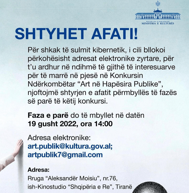 Edhe 10 ditë nga mbyllja e afatit të dorëzimit të projektideve për realizimin e 18 veprave në hapësira publike, në edicionin e parë të Konkursit Ndërkombëtar “Art në Hapësirat Publike”.