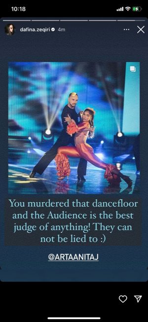 Në një postim në llogarinë e saj në “Instagram”, Dafina ka ndarë një foto të Arta Nitajt në skenë, krahas së cilës shkruan se “juria më e mirë është publiku”, duke thumbuar kështu hapur jurinë e përzgjedhur për spektaklin e kërcimit, që eleminoi Artën.
