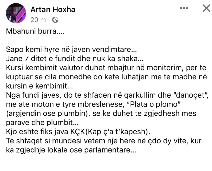 Gazetari Artan Hoxha, përmes një postimi në Facebook, shkruan me ironi se kjo javë është vendimtare, ku duhet të zgjedhësh mes parave dhe plumbit, dhe se një mundësi e tillë shfaqet vetë njëherë në dy vjet.