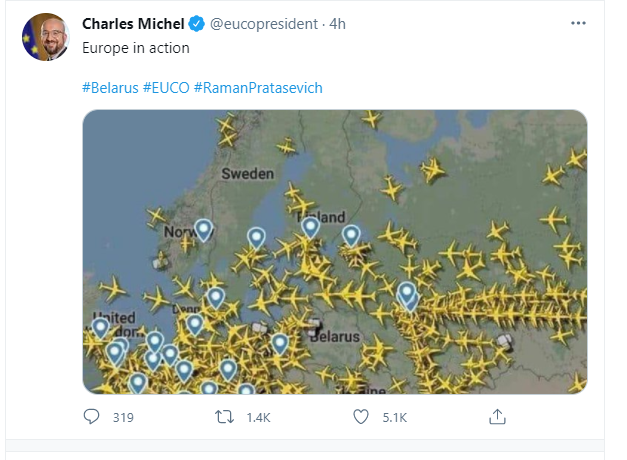 Presidenti i Këshillit Europian, Charles Michel ka publikuar në rrjetet sociale hartën ajrore e cila tregon se asnjë avion nuk fluturon në Bjellorusi.