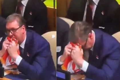 I skuqur në fytyrë dhe me flamurin serb në duar, Vuçiçi i inatosur bëhet viral! Reagimi i tij epik gjatë votimit të OKB për rezolutën kundër gjenocidit në Srebrenicë