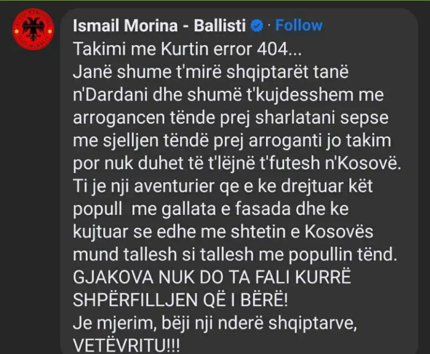 “Ti je nji aventurier qe e ke drejtuar këtë popull me gallata e fasada dhe ke kujtuar se edhe shtetin e Kosovës mund tallesh si tallesh me popullin tënd. Gjakova nuk do ta fali kurrë shpërfilljen që i bërë, Vetëvritu” ishte në pjesë e komentit të tij.