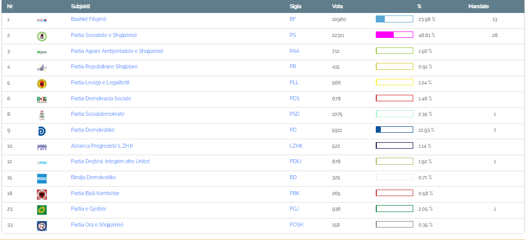 PS ka marrë 55.19% të votave duke shënuar deri më tani 28 këshilltarë, kurse “Bashkë Fitojmë” ka marrë 44.81% të votave duke siguruar vetëm 13 këshilltarë.