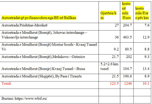 Gjatësia e autostradave që do të financohen nga BE në Ballkan është gjithsej 123 kilometër, ndërsa kosto totale e ndërtimit është 1,2 miliardë euro ose rreth 10 mln euro për kilometër. Një nga këto segmente është në Shqipëri pjesë e “Autostradës Adriatiko Joniane”. Bëhet fjalë për by-passin e Tiranës i cili ka një gjatësi 21.5 kilometër dhe do financohet me 190.6 milionë euro ose mesatarisht 8.9 milionë euro për kilometër.