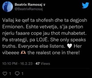 “Vallaj ke qef ta shofësh dhe ta dëgjosh Ermionën. Është vetvetja, s’ja përton njeriu faaare copë jau thotë muhabetet. Pa strategji, pa LOJË. She only speaks truths. Everyone else listens. Her vibeeee! The realest one in there!”- shkruan Beatrix.