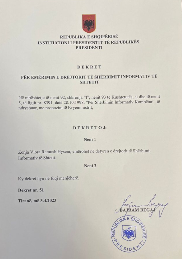 Presidenti Bajram Begaj ka dekretuar ditën e sotme emërimin e Vlora Hyseni si drejtuese të Shërbimit Informativ Shtetëror.
