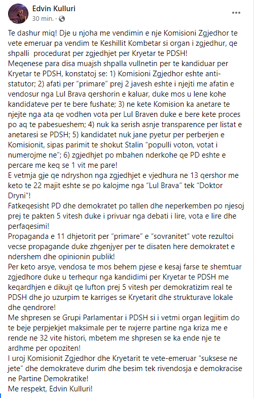 Deputeti i PD-së, Edvin Kulluri është tërhequr nga kandidatura për kryetar të Partisë Demokratike.