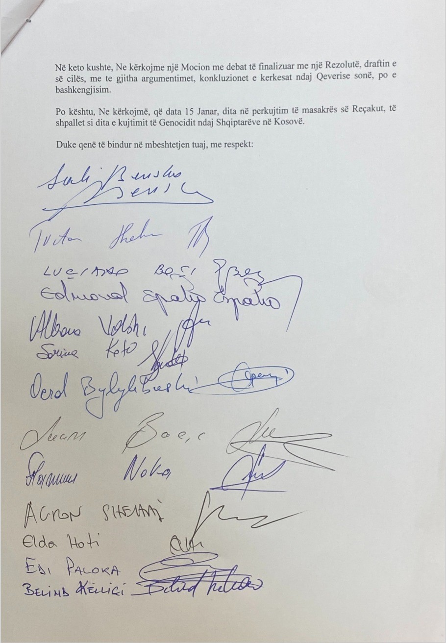 Grupi i Rithemelimit i ka dërguar një kërkesë Kryetares së Kuvendit, znj. Lindita Nikolla për një Mocion me Debat të finalizuar me Rezolutë në Kuvend në lidhje me “Njohjen e genocidit serb në Kosovë” dhe obligimet përkatëse të Qeverisë ndaj këtij akti.