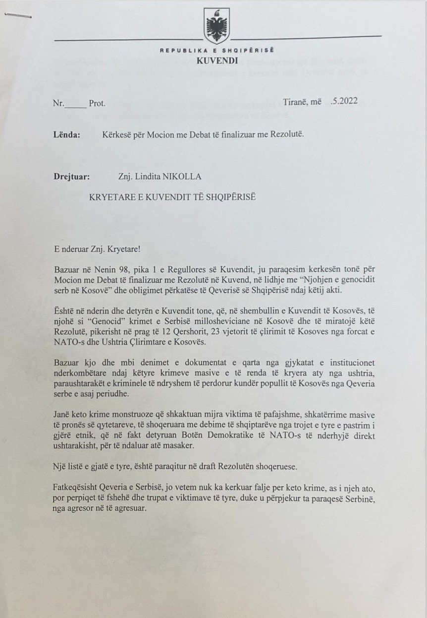 Grupi i Rithemelimit i ka dërguar një kërkesë Kryetares së Kuvendit, znj. Lindita Nikolla për një Mocion me Debat të finalizuar me Rezolutë në Kuvend në lidhje me “Njohjen e genocidit serb në Kosovë” dhe obligimet përkatëse të Qeverisë ndaj këtij akti.