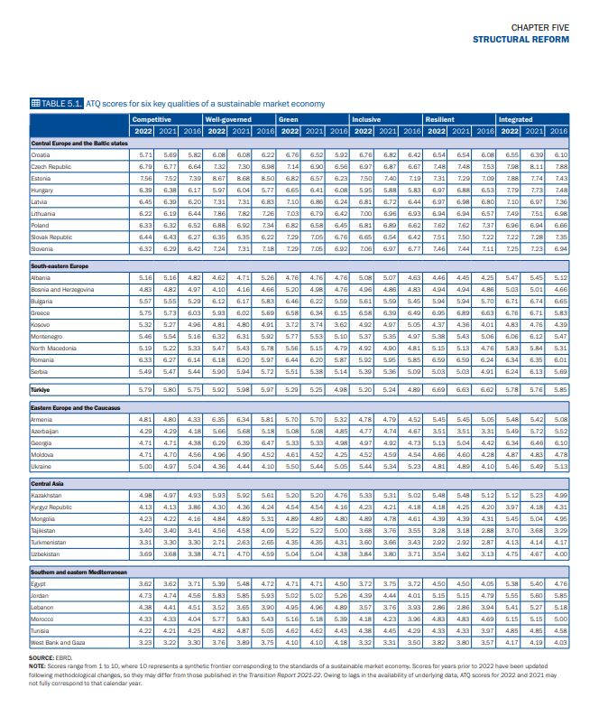 Në gjetjet për Shqipërinë të raportit për Tranzicionin të Bankës Europiane për Rindërtim dhe Zhvillim për vitin 2022-2023, cilësia e qeverisjes së Shqipërisë është në përkeqësim.
