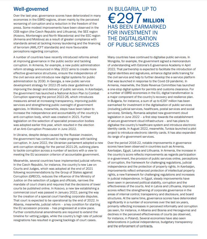 Rezultatet e qeverisjes janë përkeqësuar ndjeshëm në një numër sferash te ekonomise gjatë gjashtë viteve të fundit, duke reflektuar kryesisht rritje të informalitetit dhe korrupsionit të perceptuar siç shihet, për shembull, në Shqipëri dhe Bosnjë dhe Hercegovinë dhe rënie në efektivitetin e perceptuar të gjykatat siç vërehet, për shembull, në Poloni. Disa sfera te ekonomisë kanë parë gjithashtu përkeqësime në pavarësinë e gjyqësorit, transparencën buxhetore dhe zbatimin e kontratave.