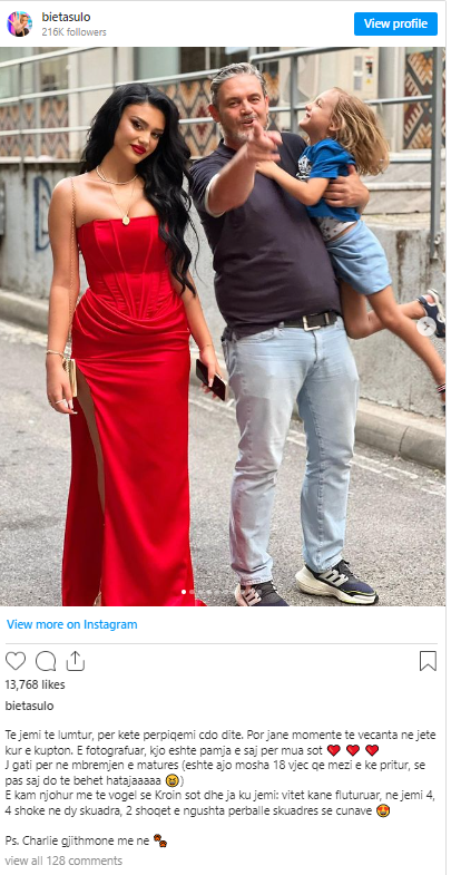 “Të jemi të lumtur, për ketë përpiqemi çdo ditë. Por janë momente të veçanta në jetë kur e kupton. E fotografuar, kjo është pamja e saj për mua sot. J gati për në mbrëmjen e maturës (është ajo mosha 18 vjeç që mezi e ke pritur, se pas saj do të bëhet hatajaaaaa). E kam njohur më të vogël se Kroin sot dhe ja ku jemi: vitet kanë fluturuar, ne jemi 4, 4 shokë në dy skuadra, 2 shoqet e ngushta përballë skuadrës se çunave”, shkruan Bieta krah një seri fotosh me Joellen.