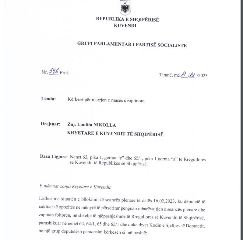Grupi Parlamentar i Partisë Socialiste i është drejtuar me një kërkesë kryetares së Kuvendit Lindita Nikolla lidhur me bllokimin e seancës plenare të datës 16.02.2023 ku deputetë të opozitës bllokuan foltoren.