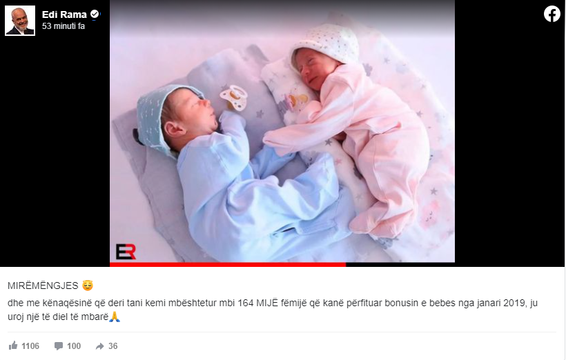 “Mirëmëngjesi dhe me kënaqësinë që deri tani kemi mbështetur mbi 164 mijë fëmijë që kanë përfituar bonusin e bebes nga janari 2019, ju uroj një të diel të mbarë”, shkruan kryeministri Rama në Facebook.