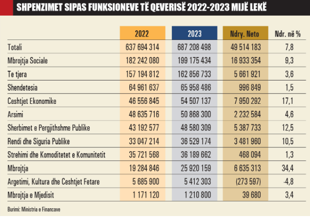 Vitin që vjen, shpenzimet për funksionet qeveritare arrijnë në 687 miliardë lekë, ose rreh 8% më të larta se pritshmëritë e këtij viti. Mirëpo fondet për shëndetësinë, në vitin 2023, do të jenë vetëm 1.5% më të larta se ky vit, ndërsa fondet për arsimin do të rriten vetëm me 4.6%. Edhe këto fonde mund të shkurtohen më tej vitin e ardhshëm, nëse buxheti përballet me situata të papritura.