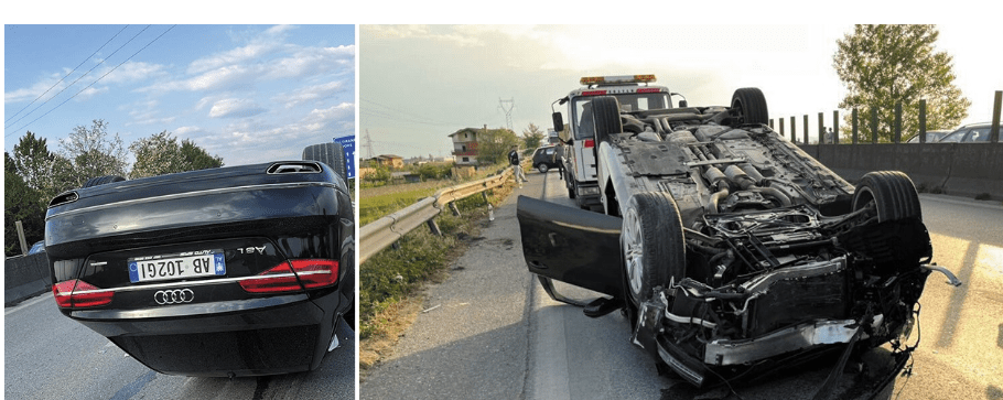 E frikshme! Kthehet përmbys makina në mes të autostradës Tiranë-Durrës (Foto)
